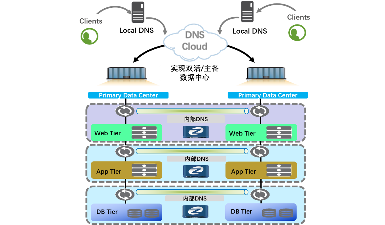 数据中心为提高应用系统的可靠性,实现多站点资源分布式部署,提高资源的利用率,需要多站点的应用系统构建成多活或主备工作模式。为了与IP地址解耦,通常会使用域名系统(DNS)来调度这些应用。918博天堂(中国)多数据中心域名(DNS)解决方案以IT整体架构为蓝图,以业务陆续在性保障为目标,利用域名解析门户应用调度功能,可将用户访问流量引流到可靠、可用的数据中心进行访问,既能保证用户的使用体验,又能达到应用容灾的无感切换的目的。